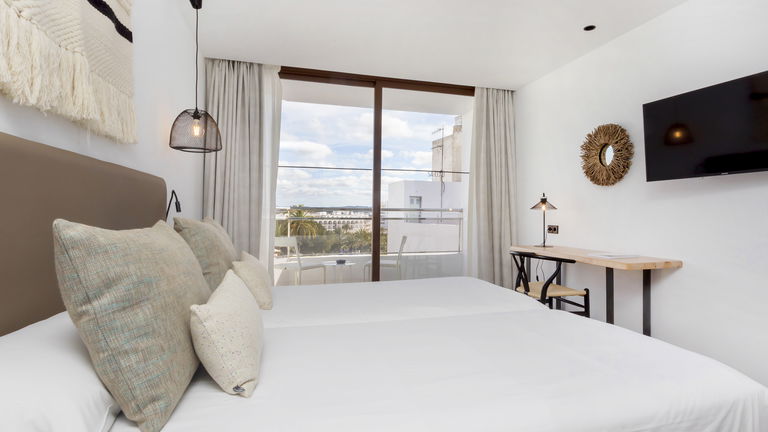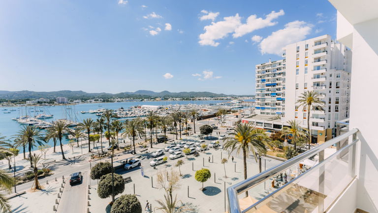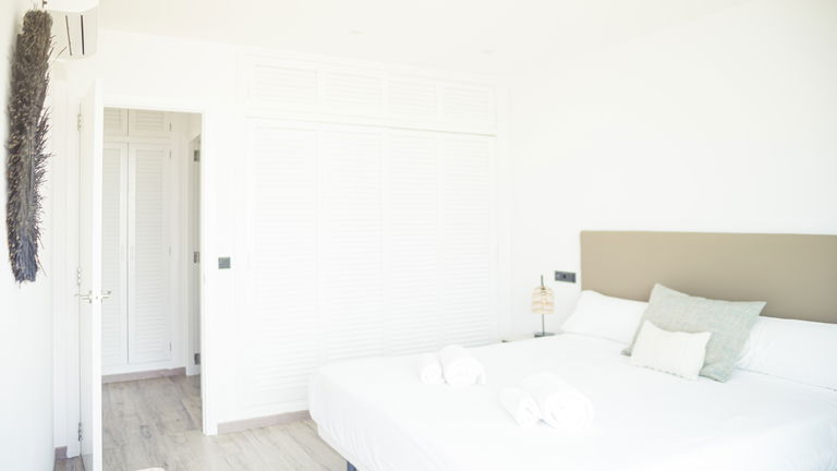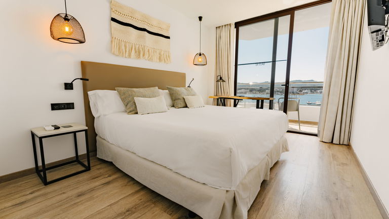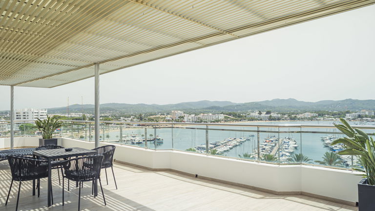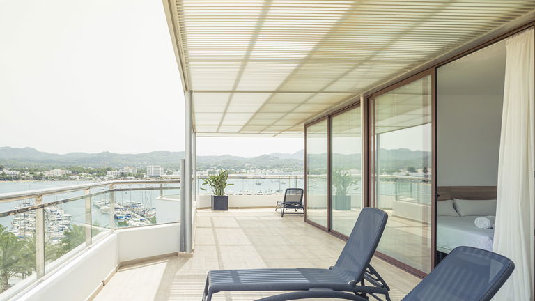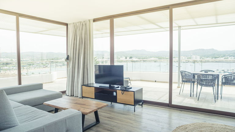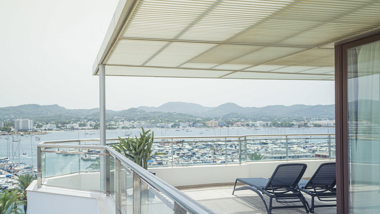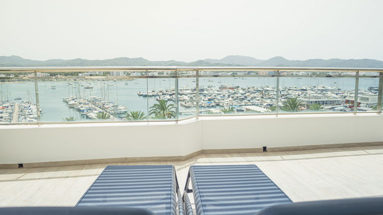 Two bedrooms penthouse, one with double bed and the other one with two single bed, complete bathroom with shower and hairdryer, satellite TV, air conditioning and heating, minibar, safe, free Wi-Fi and large terrace with views of the promenade and port of San Antonio.