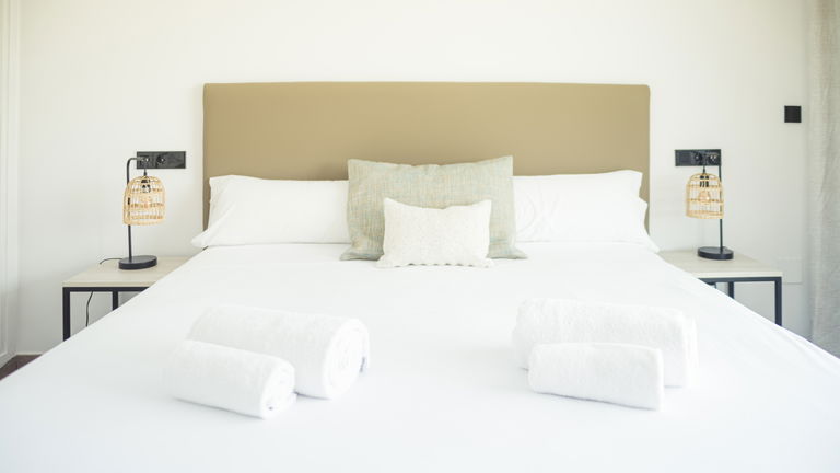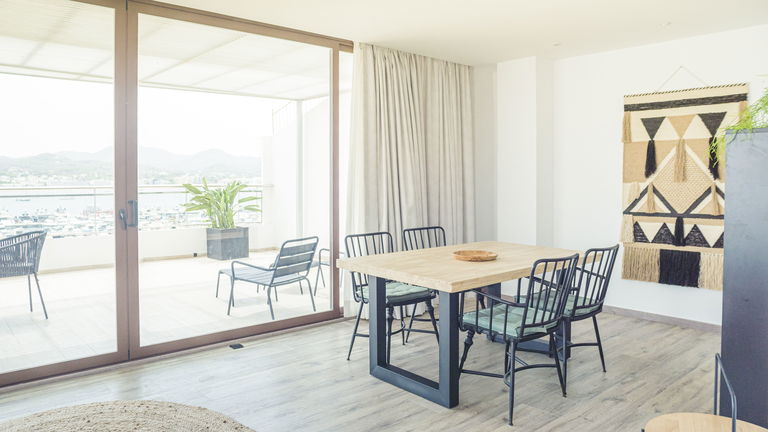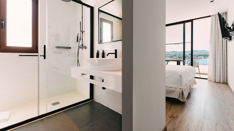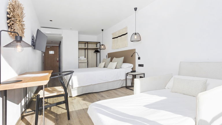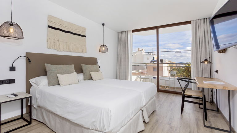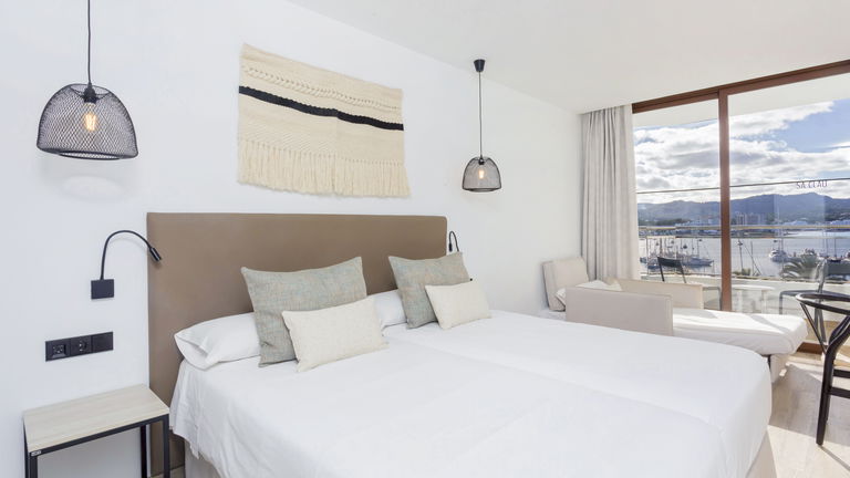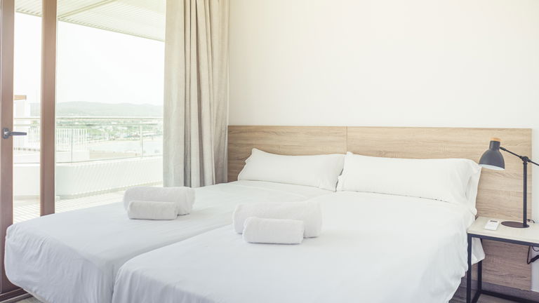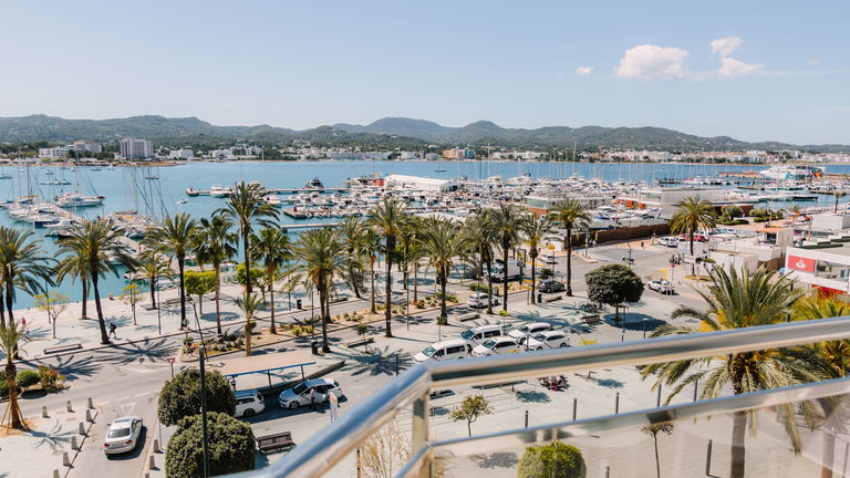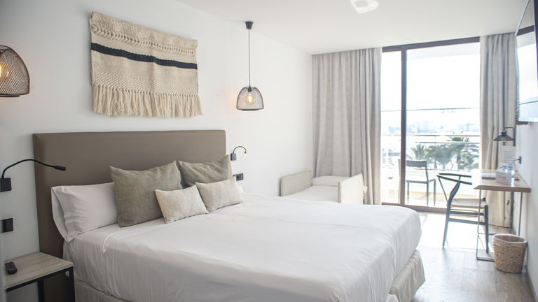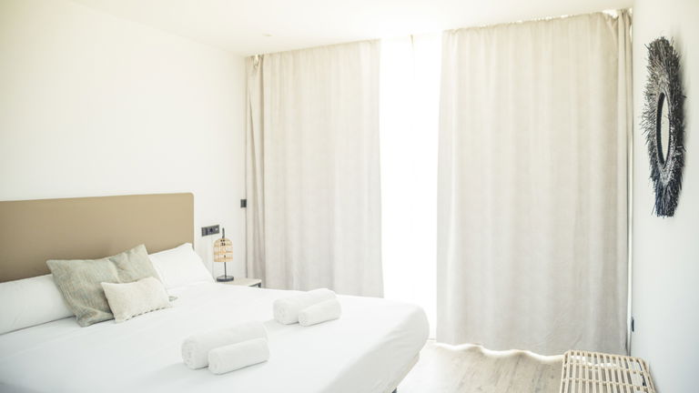 Two bedrooms penthouse, one with double bed and the other one with two single bed, complete bathroom with shower and hairdryer, satellite TV, air conditioning and heating, minibar, safe, free Wi-Fi and large terrace with views of the promenade and port of San Antonio.